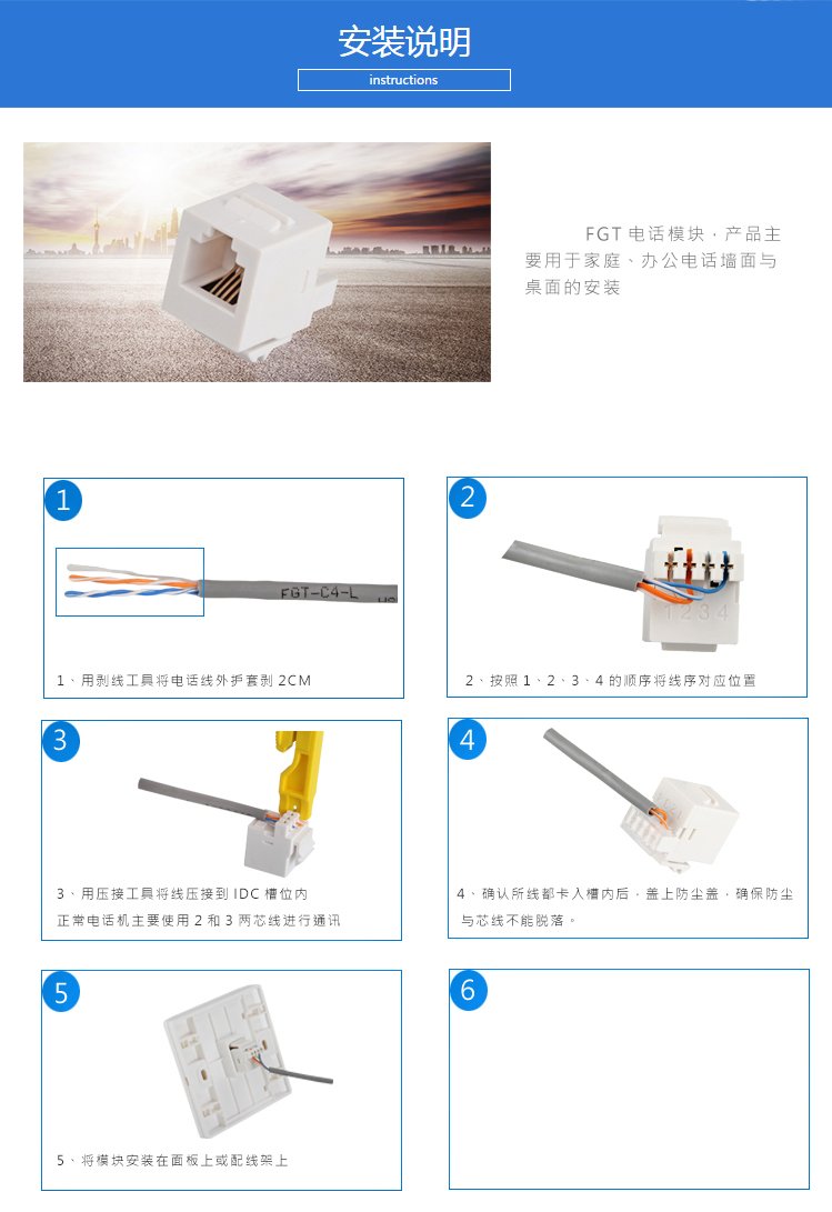 4芯電話模塊采用IDC打線壓接式安裝,用于各種電話線端接,方便快捷。執行標準:YD/T 926.3